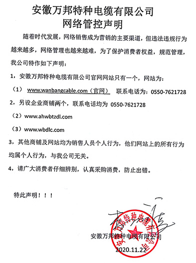 鄭重聲明:安徽萬邦特種電纜有限公司官方網站為:www_wanbangcable_com.ciyaf.org.cn,除此之外無任何子網站或合作網站,其余均為假冒偽劣。電話:0550-7621728 13485756353 地 址:安徽省天長市滁州高新技術產業開發區經四路29號